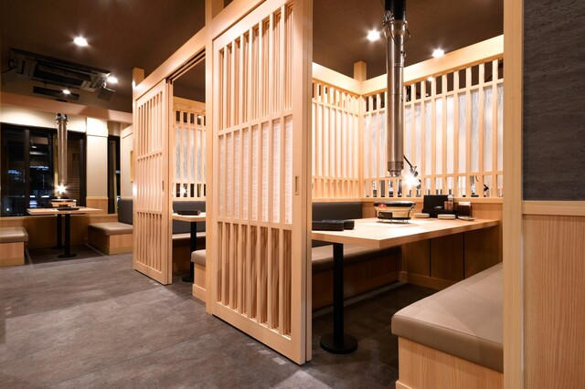 「丸明 茶屋ヶ坂店」さんの店内の様子。半個室と座敷、合わせて150席設けられた店内は開放的な空間。ファミリーでの利用がおすすめで、落ち着いてゆっくりと焼肉を楽しめます。