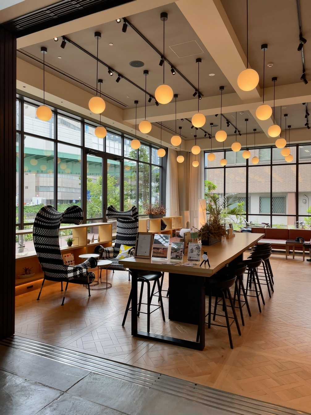 店内に入ると天井が高く開放感のある空間が広がり、思わずディスプレイに目を奪われます。電源+無料Wi-Fiありで、午前中はホテルの利用客で賑わいますが、午後になると利用者が少なくりなり、ビデオ会議もできるような空間です。