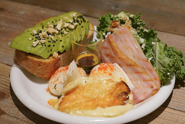 トーストにポーチドエッグ2個とサラダセット、追加で以下のトッピングが注文可能です。