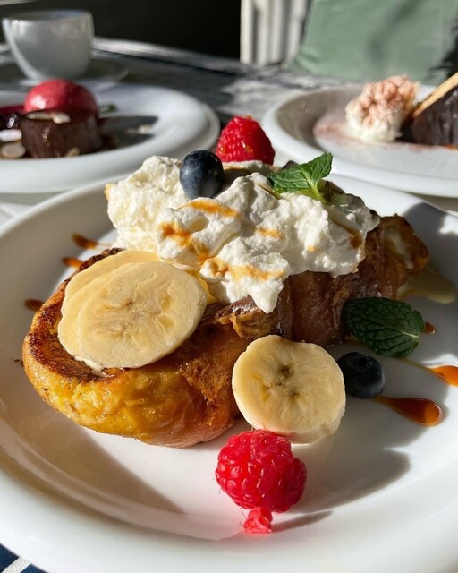 写真は「フレンチトースト ¥780(税込)」。卵液にひたひたの状態で焼き上げたトーストに、たっぷりのホイップクリーム、さらにバニラアイスとフルーツをのせた色鮮やかな仕上がりです。
