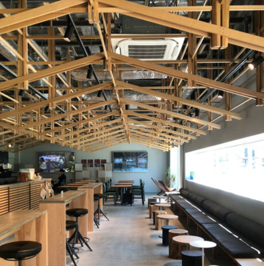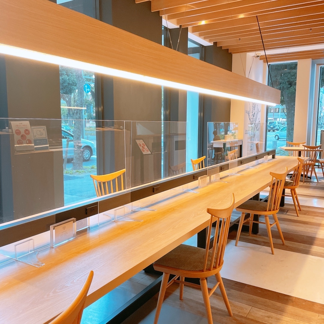 電源と無料Wi-Fi完備。有名な建築家が手掛けたという店内は、木の温もりを感じる開放感バツグンの空間。平日は特にゆったりとできるので、勉強やお仕事、ビデオ会議の場として利用する方も多くいらっしゃいます。